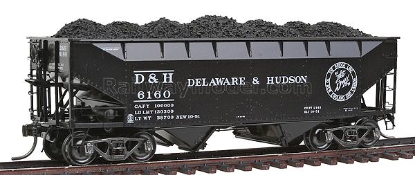 Стандартный 50-тонный двухбункерный открытый хоппер тип AAR с грузом угля. Вагон выпуска 1945 года. Принадлежность Delaware и Hudson #6160. Вагон с великолепной деталировкой, вплоть до установленных отдельных пружинках в тележках, тормозных шлангов и т.п.