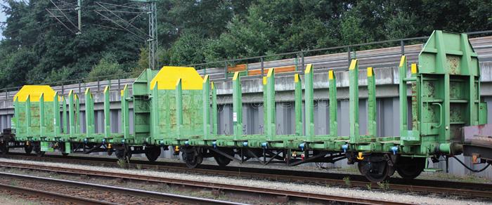 Сдвоенная платформа тип Laaps для перевозки бревен. Принадлежность DB, Германия. Эпоха V/VI