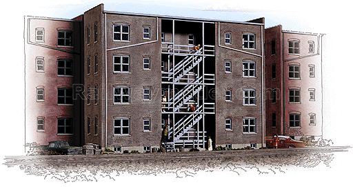 Обратная сторона дома, цвет коричневый, лестничные пролеты - серые. Размер 19.7 x 5.6 x 15.2 см. Набор для сборки специального здания для заднего фона. Прекрасный вариант для того, чтобы обеспечить плавный, реалистичный переход между передним планом и фоном, особенно на ограниченных пространствах - на краю макетов, на полках, диорамах и т.п. Представляет из себя часть здания, а также часть боковых стен и крыши. Причем ширину боковых стен можно регулировать в зависимости от Вашей потребности. Можно использовать как отдельно, так и вместе с другими строениями подобной серии, для создания большого индустриального комплекса на малой площади.